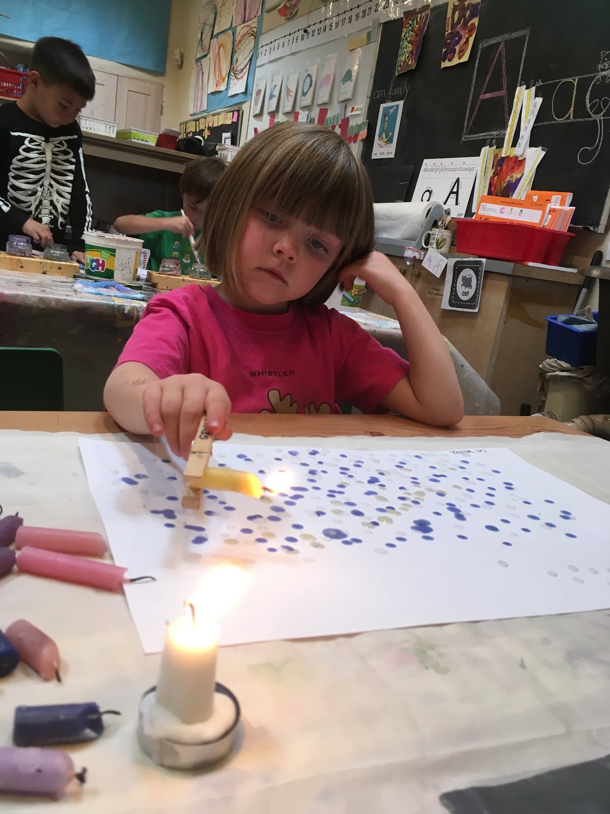 Wax resist window art (Got paper and paint -- needed: small solid color candles from Cid's)